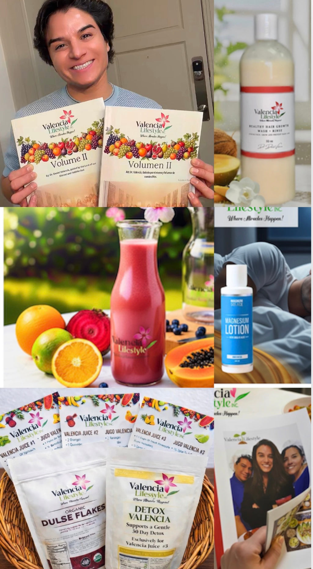 Valencia Lifestyle Volume 1 and 2 (both languages), 50oz Juice Glass Jar, Valencia Juice Recipe Magnets, Bag of Dulse Flakes for Valencia Juice #2, Detox Valencia for Juice #3, 32 oz 2:1 Shampoo/Conditioner Hair Loss Prevention and Hair Growth Promoter, and Magnesium lotion for sleep (apply on feet before bedtime)!Â